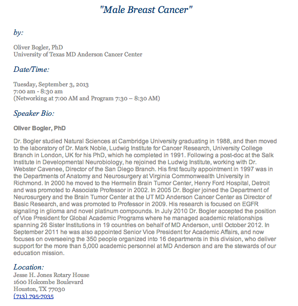 I tried to mix the personal story with the concerns I have about the lack of research on male breast cancer biology and the fact that men are still excluded from the majority of breast cancer clinical trials. I realize that people naturally connect with the personal dimensions, and tried to connect these with the drier stuff on how much research is being done in this corner of the cancer research world.