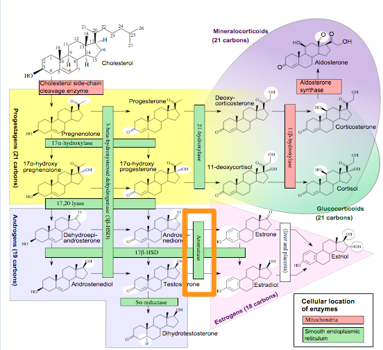 Broadly speaking there are two ways to interfere in the hormone signal: you can block the receptor or you can block the production of the hormone. Tamoxifen works by blocking the estrogen receptor, and remains the most common endocrine therapy for men with breast cancer, and is still commonly used for women. Aromatase inhibitors interfere in the production of estrogen by enzymes called aromatases, and so reduce the production of the hormones themselves. In this schematic from Wikipedia, you can see the estrogens in the pink triangle at the bottom right, and the orange box marks the aromatase enzymes that produce them.