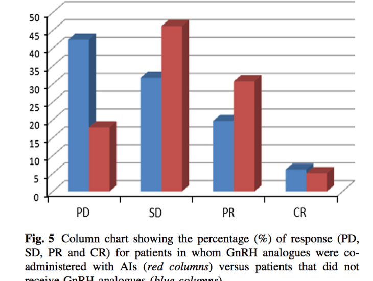Furthermore they find that the co- administration of GnRH analogues tripled the clinical benefit in terms of tumor response, for example stabilizing disease as measured by scans, which makes sense in the context of our understanding of hormone biology, as briefly discussed above. Unfortunately the addition of the GnRH analog did not statistically either increase overall survival or progression free survival.