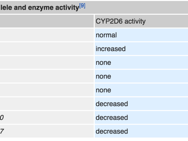 Different polymorphisms, or genetic versions if you will, of CYP2D6 and their metabolic activity. From Wikipedia (https://en.wikipedia.org/wiki/CYP2D6)