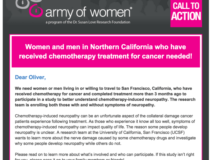 The Army of Women is a program of the Dr. Susan Love Research Foundation, and is a crowdsourcing mechanism for clinical trials. You enter the data of your cancer, and they send you announcements of trials that may be relevant. And yes, they do include men! In fact, what first caught my eye in this email was that it said “women and men”. Thank you! The obvious snag that it also said “in Northern California” did not put me off – I joined the trial!