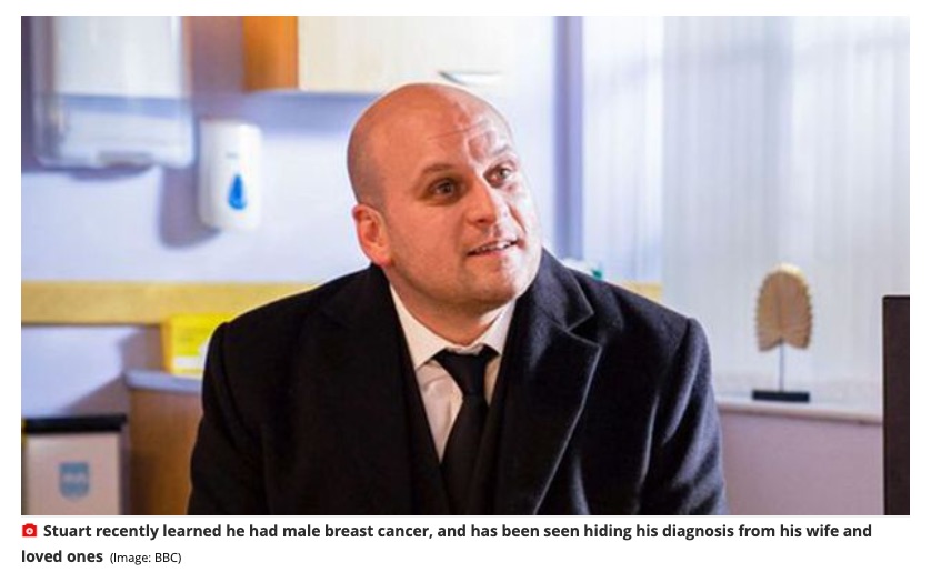 East Enders is a long running soap opera from the BBC, set in the gritty east end of London. It has been running for so long, that I remember watching it when I was a student in London in the late ’80s. Now I stumbled across the an article with spoilers for the ’22 season, one of which was that a character has a diagnosis of male breast cancer and is struggling with sharing it with those closest to him.
